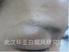 初诊时:患者的右边眉梢位置出现的白斑有指甲盖的大小,在仪器监测下发现白斑区已经呈现乳白色,同时白斑的边缘界限模糊不清,诊断白癜风还处于早期发展期