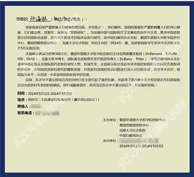 由美国华盛顿大学医学院皮肤、美国西雅图皮肤、加拿大多伦多医院、中国白癜风协会共同举办的中原区“2014中、美、加皮肤病医学医生学术峰会”将于5月在武汉隆重召开,本次会议汇集国内外顶尖皮肤病医生,是中、美、加皮肤病诊疗医生联合参与的一次高规格、高标准皮肤病高峰论坛。代表团谨在此诚挚邀请武汉环亚白癜风医院帅海林主任参与此次医学盛会。