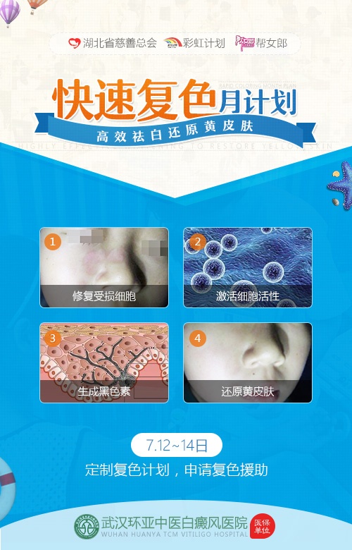 为了帮助患者快速高效祛白,武汉环亚中医白癜风医院启动“快速复色月计划”,提供专项诊疗援助,资深医生为患者量身定制快速复色方案,通过中西医结合治疗手段激活黑色素细胞的方式,还原健康黄皮肤!